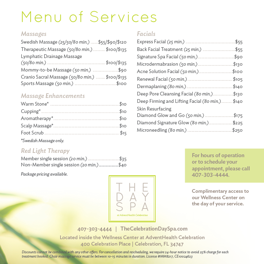 Rest is powerful. It refreshes, rejuvenates and rebuilds the mind, body and spirit. Rest empowers you to function at your best. The Day Spa at AdventHealth Celebration features a full array of luxurious spa services, organic spa products and healing spa treatments designed to nourish the whole person. Choose from massage therapy, facials, waxing, body wraps, and acupuncture. In this healing environment, you can rest, relax and let stress float away. Energize your senses and find inner peace.